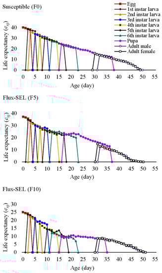 A lower survival duration of 49 days for both Flux-SEL (F5 and F10) generations than the susceptible (F0) generation (52 days) was observed from the age-specific survival rate (lx) curve (Figure 3). Similarly, a decreasing trend as susceptible (F0) > Flux-SEL (F5) > Flux-SEL (F10) was also encountered from the age-specific fecundity (mx) and age-specific maternity (lxmx). Irrespective of the tested populations, a reduced life span with the advancement of age was noticed from the life expectancy (exj) curves of FAW with a longer life in fluxametamide-selected (Flux-SEL) strain (F10) compared to the F0 strain (Figure 4). The egg stage exhibited the maximum exj of 40.1, 37.1, and 25.2 days in F0, Flux-SEL (F5), and Flux-SEL (F10) generations, respectively.