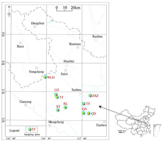 Location of FC sampling points in nine coal mines in Huaibei coalfield, China (Note: ZXZ: Zhuxianzhuang coal mine; TY: Taoyuan coal mine; QN: Qinan coal mine; QD: Qidong coal mine; RL: Renlou coal mine; XT: Xutuan coal mine; TT: Tongting coal mine; LH: Linhuan coal mine; WLH; Wolonghu coal mine).