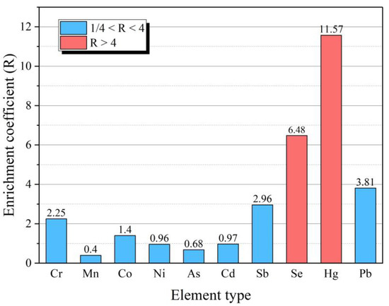 In order to reflect the enrichment degree of HEs in FC in Huaibei coalfield, the ratio (R) of the arithmetic average value of the element content in FC to the average value of this element in World coal is taken as a mark to measure the element content level in FC in the study area (Table 4). R > 4 indicates a “High” content level, R < 1/4 indicates a “Low” content level, and the other is a “Normal” content level [31]. The enrichment coefficient (R) of HEs in FC is shown in Figure 3. Se and Hg are at “High” content level, and Pb is at “Normal” content level, but the R value is larger and closer to 4. Other elements are at “Normal” content level and none at “Low” content.