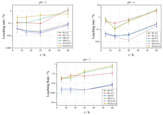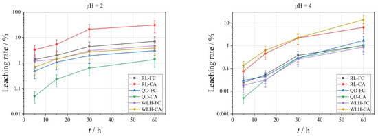 The curve of the relative leaching rate (LHg) of Hg element under different pH conditions is shown in Figure 5. With the increase in leaching time, the leaching amount of different FC and CA samples shows an increasing trend. Specific performance is as follows: