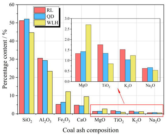 Main element composition of FC ashed in the main coal seam of three typical coal mines. In the figure, RL: Renlou coal mine; QD: Qidong coal mine; WLH: Wolonghu coal mine.