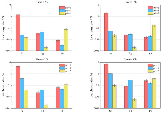 Variation of leaching rates of Se, Hg, and Pb in the RL-FC under different pH values and leaching time conditions.