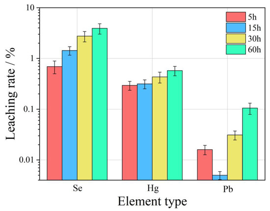 Globally, the changes in Se, Hg, and Pb leaching rates in WLH-CA under different leaching time conditions are presented in Figure 11. It can be seen from the figure, in general, thst the leaching rate of the same element increases with the increase in leaching time. The leaching rates of both Se and Hg elements increase with the increase in leaching time, and the leaching rate of Pb tends to decrease during 5–15 h and increase within 15–60 h.