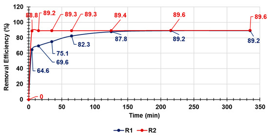 Typical experiments, as described in Section 2, were carried out according to recently reported indications [27,37]. Figures S10 and S11 (Section S4 in Supplementary Materials) show the appearance of NO2− solutions treated with the GRS at time T0 (untreated solutions, cuvette 1 on the left), NO2− solutions during treatment with R1 (Figure S10) and R2 (Figure S11) after 5, 15, 35, 65, 125, 215, and 335 min (cuvettes 2–8 from the left to right), and of blank solutions (cuvette B on the right). The UV–Vis spectra of solutions under treatment were measured at fixed time points (T5, T15, T35, T65, T125, T215, T335), after dilutions of 1:100 and treatment with GRS (250 µL). Using the absorbance data and the related concentrations of NO2− obtained using Equation (1), we calculated the removal efficiency of both resins (R%), the amounts of NO2− adsorbed per unit mass of R1 and R2 (mg/g and mmol/g) at the fixed times (Qt), and the amounts of NO2− adsorbed by R1 and R2 at equilibrium (Qe) (mmol/g) using the Equations (1)–(3) (Section 2), respectively. The values of the removal efficiency (R%) of R1 and R2 were plotted vs. times, obtaining the cumulative removal percentage graphs reported in Figure 1.