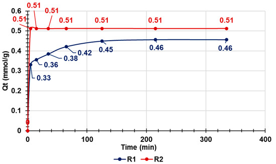 However, both resins reached their maximum removal efficiency after the same time of 215 min. Using Equation (3) reported in Section 2, we obtained the amounts of NO2− adsorbed per unit mass of R1 and R2 (mmol/g) at the fixed times (Qt), which were plotted vs. times, obtaining the adsorption kinetic curves reported in Figure 2, whose trend was perfectly comparable to that of the cumulative removal efficiency in Figure 1.