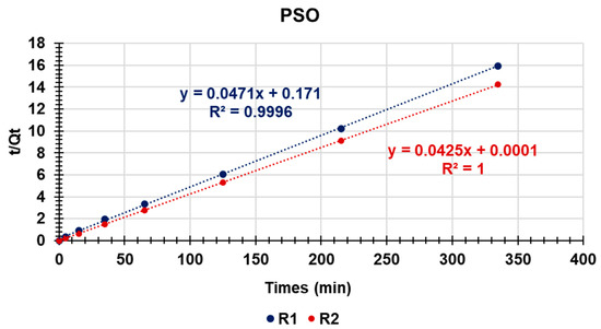 In the processes governed by the PSO kinetics, the velocity-limiting step is considered to be chemical adsorption through the sharing or exchange of electrons between the adsorbent and the adsorbed or electrostatic interactions [27]. Therefore, as previously supposed, electrostatic interactions were confirmed to be the main mechanism by which both R1 and R2 adsorb nitrite.