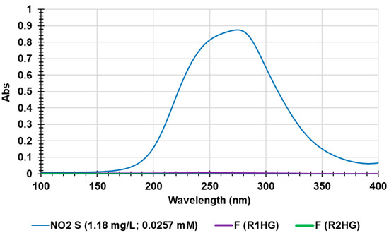UV–Vis spectra of NO2− solutions after treatment with GRS before filtration (blue line) and after filtration through R1HG (purple line) and R2HG (green lines). Columns: 10 mL hydrogels; pH = 7.5; room temperature (r.t.). Filtrations were carried out by applying compressed air to the top of the columns to completely empty the columns. NO2 S = NO2− solution (118 mg/L; 2.57 mM) after dilution 1:100; F (R1HG) and F (R2HG) = NO2− solutions (118 mg/L; 2.57 mM) after filtration by R1HG and R2HG, respectively, and after dilution of 1:100.
