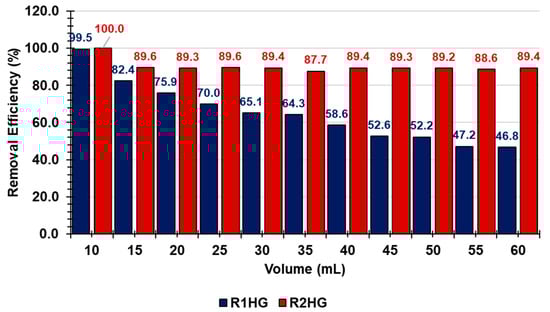 Removal efficiency values of R1HG and R2HG during filtration of increasing volumes of NO2− solutions 118 mg/L (2.57 mM).