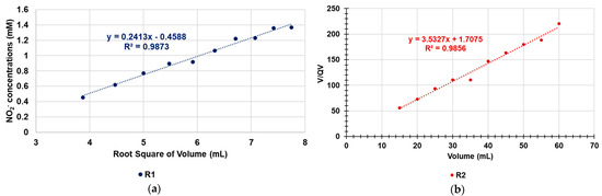 Q60 (mM) and QV (mM) are the NO2− concentration in the effluents at the bottom of the R1HG and R2HG columns after the filtration of 60 mL and after the filtration of a volume V, respectively. K1 is the kinetic constant of the PFO kinetic model (1/mL), K2 is the equilibrium constant velocity of the PSO kinetic model (g/mM), K int is the IPD rate constant (mM mL0.5), and I is the intercept of the linear curve (mM). The values of ln(Q60 − QV), V/QV, and QV were plotted vs. volumes, the volumes themselves, and the root square of the volumes (RSV), respectively. Table 10 reports the coefficients of determination (R2) of all the equations of the linear regressions obtained for all kinetic models.
