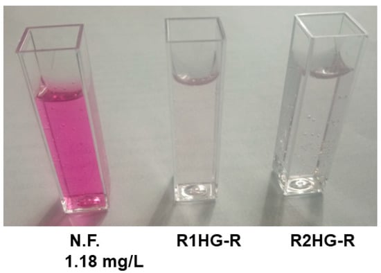 Then, R1HG-R- and R2HG-based columns like those described in Section 3.2.3 were prepared and used to filter 10 mL of the nitrite solutions of 118 mg/L (2.57 mM), as previously described. As shown in Figure 8, neither filtrate assumed a pink coloration after dilution at 1:100 and treatment with the GRS, which was different from the unfiltered (N.F.) solution treated in the same conditions.