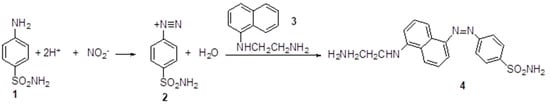 So far, several techniques have been developed for nitrite detection. Among these, electrochemical and fluorescent methods have high sensitivity, but tedious sample preparation or instruments for signal transduction are required [39]. Nanometal–polymer composites (NMPCs), synthesized by the immobilization of inorganic metal quantum dots (especially noble transition metals) onto organic polymers, have demonstrated advanced optical and electrical properties, which are also exploitable for developing sensors and for detection purposes [40]. In particular, plasmonic nanoparticles have emerged as a promising tool for designing sensitive colorimetric detection schemes in recent years, due to their unique optical property of localized surface plasmon resonance (LSPR) dependent on their size, shape, and inter-particle distance [41,42,43]. Gold nanoparticles are among the most extensively studied plasmonic materials for colorimetric assay due to their strong LSPR and ease of chemical modification [41,42]. The Griess reagent system provides a simple and well-characterized colorimetric assay for the determination of nitrites with a detection limit of about 100 nM. The GRS measures the nitrite (NO2−) by relying on a diazotization reaction that was originally described by Griess in 1879 [44]. Through the years, many modifications to the original reaction have been described. Particularly, the GRS is based on a chemical reaction that can occur between sulfanilamide and N-1-naphthylethylenediamine dihydrochloride (NED) under acidic (phosphoric acid) conditions in the presence of NaNO2. At an acidic pH (pH 2.0–2.5), sodium nitrite affords nitrous acid, which nitrogenates the sulfanilamide, thus providing a diazonium salt that in turn couples with N-(1-naphthyl)-ethylenediamine, affording an azo dye compound. The obtained azo dye has a color that can vary from pink to red to purple based on its concentration, and it is possible to measure its absorbance at 520 nm. These reactions are detailed in Scheme 1.
