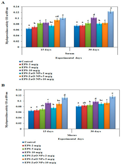 In this assay, the mucus and serum of LYZ activity were increased substantially (p < 0.05) in the EPS and EPS-ZnO NPs experimental diet groups and compared to control groups after 15 and 30 days of the feeding trial (Figure 5A,B). In fish serum on day 15, those fed EPS and EPS-ZnO NPs (10 mg/g) showed 1.173 U and 1.511 U, whereas on day 30, lysozyme activity was increased to 1.74 U and 2.049 U, respectively. In fish mucus on day 15, those fed with EPS and EPS-ZnO NPs (10 mg/g) showed 1.21 U and 1.217 U, whereas on day 30, the level of myeloperoxidase was increased to 1.23 U and 2.227 U, respectively. The mucus showed the highest LYZ level, which correlated with serum after 30 days of the diet.