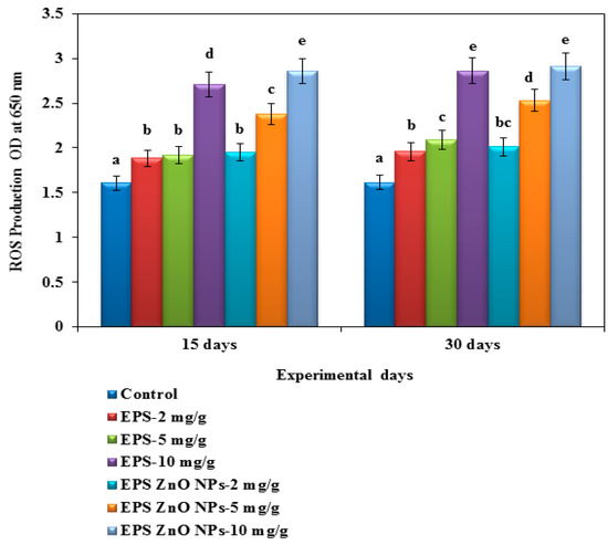 Respiratory burst activity/reactive oxygen species production/nitroblue tetrazolium (NBT) assay of O. mossambicus fed with EPS and EPS-ZnO NPs. T-bars indicate three replicates of mean ± SD, and different letters correspond to the statistical difference between treated groups.