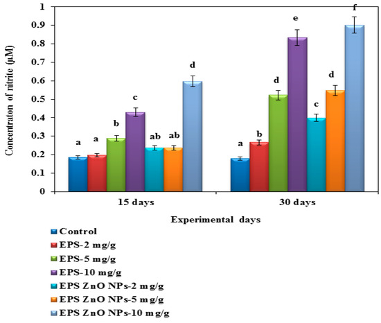 Reactive nitrogen species of O. mossambicus fed with EPS and EPS-ZnO NPs. T-bars indicate three replicates of mean ± SD, and different letters correspond to the statistical difference between treated groups.