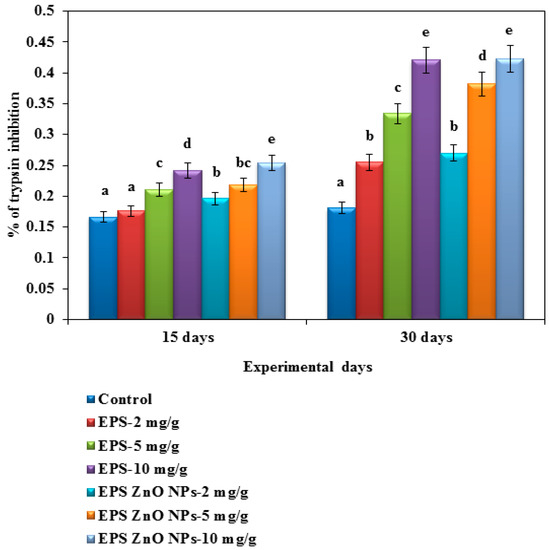 Antiprotease activity of O. mossambicus fed with EPS and EPS-ZnO NPs. T-bars indicate three replicates of mean ± SD, and different letters correspond to the statistical difference between treated groups.