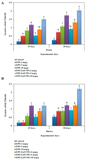 Lysozyme activity of O. mossambicus fed with EPS and EPS-ZnO NPs: (A) serum and (B) mucus. T-bars indicate three replicates of mean ± SD, and different letters correspond to the statistical difference between treated groups.