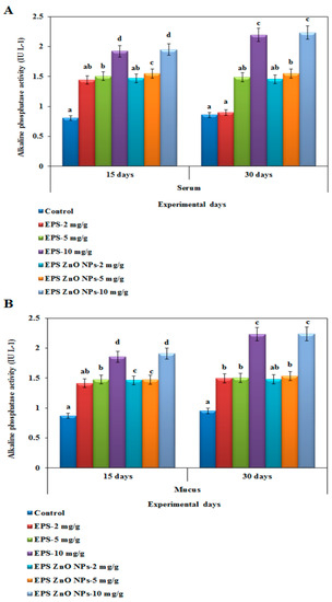 Figure 6A,B show the ALP activity of serum and mucus in fish fed with EPS and EPS- ZnO NPs. Higher alkaline phosphatase activity was noted at 10 mg/g of the EPS-ZnO NPs diet (0.421 U), which corresponded to EPS (0.423 U) on day 30. Conversely, lower activity was shown with 2 mg/g of EPS (0.255 U) on day 30.