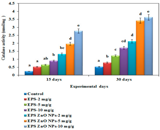 Catalase activity (CAT) of O. mossambicus fed with EPS and EPS-ZnO NPs. T-bars indicate three replicates of mean ± SD, and different letters correspond to the statistical difference between treated groups.