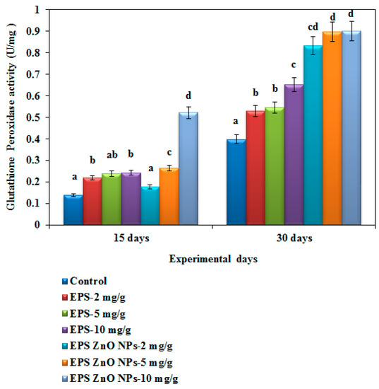 Glutathione peroxidase activity (GPx) of O. mossambicus fed with EPS and EPS-ZnO NPs. T-bars indicate three replicates of mean ± SD, and different letters correspond to the statistical difference between treated groups.