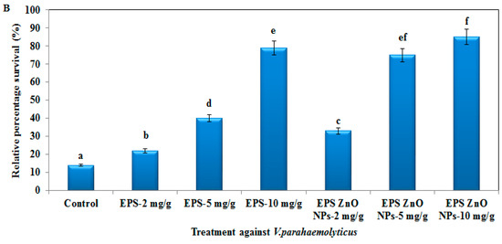 On the other hand, pathogen challenge tests are appropriate to examine the perceptible effect of EPS and EPS-ZnO NPs on the defense tolerance against pathogens. After being exposed to A. hydrophila and V. parahaemolyticus, fish fed with the EPS and EPS-ZnO NPs diet survived substantially more than the control. Compared to EPS (76% in A. hydrophila and 79% in V. parahaemolyticus), EPS-ZnO NP-fed fish had a higher survival rate (93% in A. hydrophila and 85% in V. parahaemolyticus). In agreement with our observations, similar observations were described with Nile tilapia fed a probiotics diet and exposed to S. agalactiae [78]; goldfish fed with E. acetylicum S01 and exposed to A. hydrophila [79]; O. mossambicus fed with B. licheniformis and exposed to A. hydrophila [18]; L. plantarum fed a VSG3 diet and exposed to A. hydrophila [80]; L. rohita fed with VSG2 and exposed to P. aeruginosa [81]; and O. mykiss fed with combined inactivated E. faecilis and mannon oligosaccharides and exposed to A. salmonicida [82].