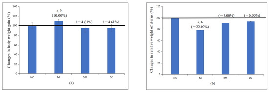 (a) Changes in body weight gain and (b) uteri-relative weight in all experimental groups. NC: normal control group; M: microplastics group (PS-MPs 2.5 mg/kg); DM: Kelulut honey group (PS-MPs 2.5 mg/kg + KH 1200 mg/kg); and DC: Kelulut honey control group (KH 1200 mg/kg). Data are expressed as mean SEM. a p < 0.05 vs. NC. b p < 0.05 vs. DM.