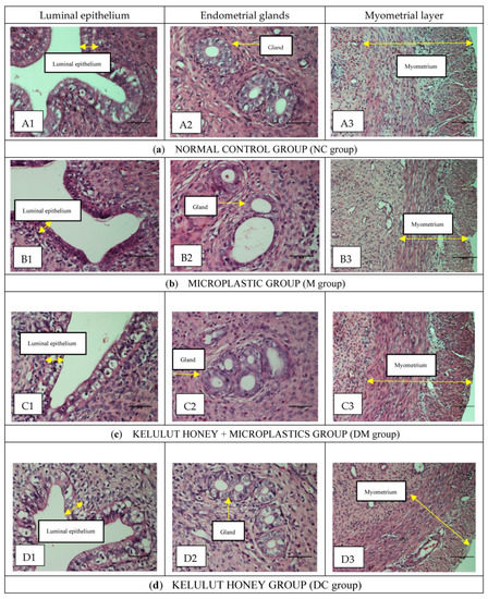 As shown in Figure 2a(A1–A3), the normal control rats (NC group) had a normal histological appearance. The luminal epithelial was made up of tall pseudostratified epithelium located on a conspicuous basement membrane. Most luminal epithelial cells are cuboidal, thick, and contain a larger number of goblet cells with well-rounded nuclei. The endometrial appears healthy, with intact endometrial glands and high cellular content in the stroma. In addition, most of the endometrial glands in this group have a thick epithelial layer with a firm and circular shape without any contamination in the lumen. Moreover, the myometrium looked healthy and in a thick layer. The histological appearance of the uterus of rats treated with Kelulut honey only (group DC) was comparable to that of the normal control rats (NC group) (Figure 2d(D1–D3)).