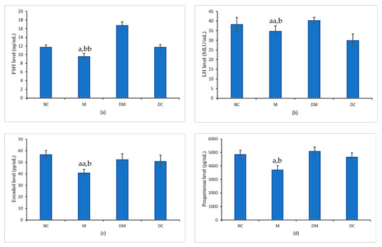 Level of (a) 17β-estradiol (, (b) progesterone, (c) FSH and (d) LH for all experimental groups. NC: normal control group; M: microplastics group (PS-MPs 2.5 mg/kg); DM: Kelulut honey group (PS-MPs 2.5 mg/kg + KH 1200 mg/kg); and DC: Kelulut honey control group (KH 1200 mg/kg). Data are expressed as mean SEM. a p < 0.05 vs. NC. aa p < 0.01 vs. NC. b p < 0.05 vs. DM. bb p < 0.01 vs. DM.