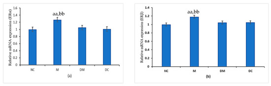 (a) The ERα gene’s relative quantitative expression in all experiment groups. (b) The ERβ gene’s relative quantitative expression in all experiment groups. NC: normal control group; M: microplastics group (PS-MPs 2.5 mg/kg); DM: Kelulut honey group (PS-MPs 2.5 mg/kg + KH 1200 mg/kg); and DC: Kelulut honey control group (KH 1200 mg/kg). Data are expressed as Mean SEM. aa p < 0.01 vs. NC and bb p < 0.01 vs. DM.