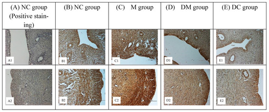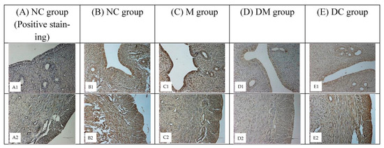 To analyze cell-specific changes in ERα and ERβ proteins, representative uterine tissue sections were stained using an immunohistochemical method. These proteins are distributed in the nuclei of uterine epithelial, myometrial, and stromal cells. Figure 5 shows the distribution of ERα in uterine tissues of all experimental groups. Compared with the normal control rats (NC group: B1, B2), a higher intensity of immunostaining was observed in PS-MPs-exposed rats (M group: C1, C2). Concurrent treatment with Kelulut honey (DM group: D1, D2) reduced the color intensity, which was comparable to that of DC group (E1, E2), however, having lower color intensity compared to NC group.