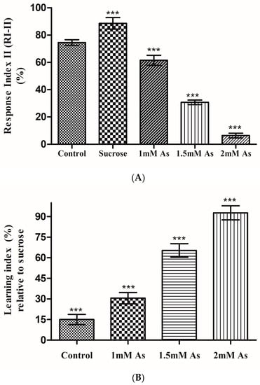 - Anushree, A.; Ali, M.Z.; Ahsan, J. Acute Exposure to Arsenic Affects Cognition in Drosophila melanogaster Larvae. Entomol. Appl. Sci. Lett. 2022, 9, 70–78. [Google Scholar] [CrossRef]