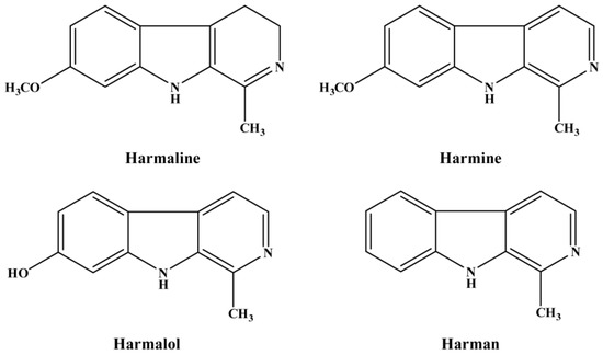 Molecular structural formulas off our isolated alkaloids (harmaline, harmine, harmalol, and harman) from Peganum harmala seeds.