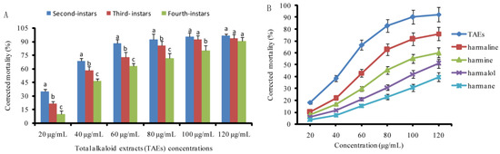 Individual toxicity of the tested alkaloids against Aedesalbopictus larvae. (A) Corrected mortality of the total alkaloids of P. harmala seeds (TAEs) against the second-, third- and fourth-instar larvae of A. albopictus at 48 h post-treatment. (B) Comparison of individual toxicity of pure alkaloids and TAEs against third-instar larvae of A. albopictus at 48 h post-treatment. Corrected mortality (±SE) followed by different letters in the same concentration in bars indicate significant difference (p < 0.05) according to Tukey’s test.