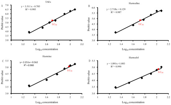Evaluation of the median lethal concentration (LC50) of the tested alkaloids against third- instar larvae. Linear regression analysis of the log value of alkaloid concentrations and probit value of larval mortalities at 48 h post-treatment. (A) TAEs, (B) harmaline, (C) harmine, and (D) harmalol, with the LC50 values of 44.54 ± 2.56, 55.51 ± 3.01, 93.67 ± 4.53, and 117.87 ± 5.61 μg/mL, respectively. The LC50 value was calculated from the average of three replicates.