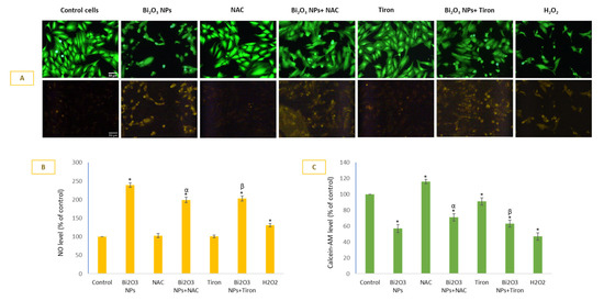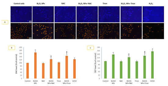Production of O2•− was measured by DHE live imaging (A) and DHE fluorescence calculation (B) in ImageJ software. DCFHDA was used to detect H2O2 (C). Data represented are mean ± SD of three identical experiments (n = 3) conducted in triplicate. * Statistically significant difference compared to the controls (p < 0.05). Any significant (p < 0.05) difference in response from that mediated by NPs and the addition of either NAC or Tiron is denoted by α and β, respectively.