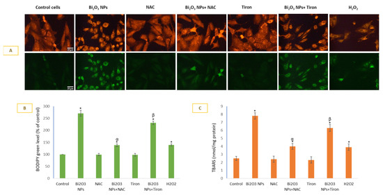Lipid peroxidation (LPO) was detected using live-cell imaging dye (A) that preferentially localizes in a hydrophobic environment and fluoresces green in proportion to LPO. BODIPY green fluorescence was calculated in ImageJ software (B). LPO was also assessed by a more conventional method by quantifying TBARS spectrophotometrically (C). Data represented are mean ± SD of three identical experiments (n = 3) conducted in triplicates. * Statistically significant difference compared to the controls (p < 0.05). Any significant (p < 0.05) difference in response from that mediated by NPs and the addition of either NAC or Tiron is denoted by α and β, respectively.