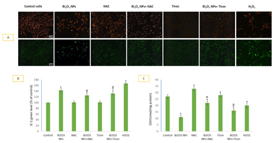 MMP was detected by JC-1 imaging in cells (A) and plotting green JC-1 fluorescence (B) in which green fluorescence is directly proportional to loss of MMP. Antioxidant GSH was also evaluated under various treatment conditions (C). Data represented are mean ± SD of three identical experiments (n = 3) conducted in triplicate. * Statistically significant difference compared to the controls (p < 0.05). Any significant (p < 0.05) difference in response from that mediated by NPs and the addition of either NAC or Tiron is denoted by α and β, respectively.