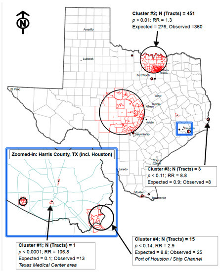 The following are available online at https://www.mdpi.com/article/10.3390/toxics11040351/s1, Figure S1: Map of pediatric brain tumor clusters labeled, Texas, 2000–2017.
