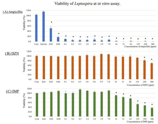 Viability of L. interrogans in in vitro assay using ampicillin (A), diazinon (B), and IMP (C) (Mean ± SE, n = 3). To begin, 9 × 105 Leptospira cells were incubated with serial twofold dilutions of diazinon, IMP, or ampicillin ranging from 0.03 to 500 ppm (final concentration) in Ellinghausen–McCullough–Johnson–Harris medium containing 1% methanol in a 96 well plate. After 3 days of incubation at room temperature, 20 µL of 10-fold diluted AlamarBlue Cell Viability Reagent was added to each well. On the fifth day of incubation, absorbance at 570 nm was measured. The optical zero was made using the negative control well. Cell viability was expressed as a ratio with the negative control wells (%). Assays were performed in triplicate. * p < 0.05 (Steel test). Viability was significantly lower than control above a concentration of 250 ppm and 16 ppm for DZN and IMP, respectively.