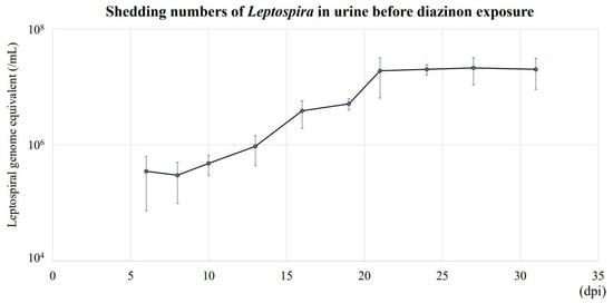 Urine samples of Leptospira-infected mice (Lepto group) were collected at 6, 8, 10, 13, 16, 18, 21, 24, 27, and 31 days post infection (dpi) before diazinon exposure. Genomic DNA was extracted from 20 µL of urine of Leptospira-inoculated mice. Leptospiral DNA in urine was quantified by absolute quantification of 16S rRNA gene, and the quantity of leptospiral DNA in urine was shown as leptospiral genome equivalent per mL urine (Mean ± SD, n = 9). The concentration of L. interrogans shed in urine increased until 21 dpi and reached a plateau at approximately 2 × 107 genome equivalents/mL.