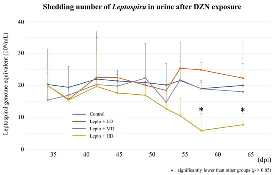 The concentration of L. interrogans shed in urine increased until 21 dpi and reached a plateau at approximately 2 × 107 genome equivalents/mL (Figure 2). After DZN exposure, there was no significant differences in urinary L. interrogans among all groups until 53 dpi (Figure 3). However, urinary L. interrogans in Lepto + HD was significantly lower than other groups at 56 dpi (Lepto + HD: 0.58 ± 0.53 × 107 /mL vs. control: 1.89 ± 0.25 × 107/mL, p = 0.012; vs. Lepto + LD: 2.48 ± 0.23 × 107/mL, p = 0.021; vs. Lepto + MD: 1.89 ± 0.20 × 107/mL, p = 0.010) and at 63 dpi (Lepto + HD: 0.77 ± 0.35 × 107/mL vs. control: 1.99 ± 0.69 × 107/mL, p = 0.006; vs. Lepto + LD: 2.22 ± 1.07 × 107/mL, p = 0.019; vs. Lepto + MD: 1.79 ± 1.09 × 107/mL, p = 0.043).