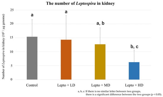 Leptospiral DNA in kidney tissue was quantified by absolute quantification of 16S rRNA gene. Quantity of leptospiral DNA in kidney was shown as leptospiral genome equivalent per µg genome (Mean ± SD, n = 9). LD, MD, HD means low, medium, and high-dose DZN exposure, respectively. Letters above the bars (a, b, and c) represent the statistical differences. If two groups share the same letter, there is no significant difference between the two groups. If there is no similar letter between two groups, there is a significant difference between the two groups. (p < 0.05, Steel–Dwass test). The levels in the Lepto + HD group were significantly lower than those of the control and Lepto + LD groups.
