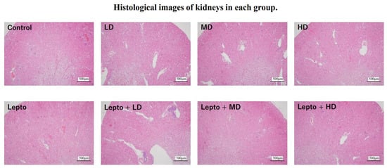 Kidney L. interrogans levels at 63 dpi (32 days after DZN exposure) are shown in Figure 4. The levels in the Lepto + HD group was significantly lower than those of the control and Lepto + LD groups (Lepto + HD: 0.62 ± 0.44 × 104/µg vs. control: 1.54 ± 0.62 × 104/µg, p = 0.019; vs. Lepto + LD: 1.43 ± 0.88 × 104/µg, p = 0.032). There was no statistical difference between Lepto + LD and Lepto + MD groups (1.27 ± 0.59 × 104 /µg, p = 0.33).