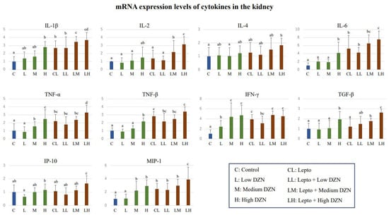 Total RNA was extracted from the renal cortex and used for cDNA synthesis. Absolute quantification of gene expression levels of cytokines including IL-1β, IL-2, IL-4, IL-6, TNF-α, TNF-β, IFN-γ, TGF-β, MIP-1, and IP-10 were performed (Mean ± SD, n = 9). Expression levels of targeted cytokine genes in each mouse group are represented as the ratio to that of the control group. Letters above the bars represent statistical differences, i.e., if two groups share the same letter, there is no significant difference between the two groups; if there is no similar letter between two groups, there is a significant difference between the two groups. (p < 0.05, Steel–Dwass test). Several cytokine gene expression levels were elevated as a result of DZN exposure. Elevated expression levels by Leptospira infection were also observed in several cytokine genes. Furthermore, DZN exposure to Leptospira-infected mice additively increased the expression of these cytokine genes.