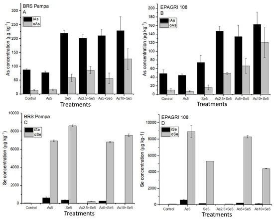 Organic forms of As (o-As: DMA) for BRS Pampa ranged from 14.2 ± 2.51 µg kg−1 (Control) to 127 ± 37.3 µg kg−1 (As10 + Se5). For EPAGRI 108, the o-As ranged from 7.19 ± 1.29 µg kg−1 (Se5) to 121 ± 35.3 µg kg−1 (As10 + Se5). Similar to the results for i-As, the concentration of o-As also presented significant statistical differences among the treatments with and without soil addition of As for both cultivars (Control and Se5 are statistically different from As5 and As5 + Se5) as reported in Figure 1A,B.