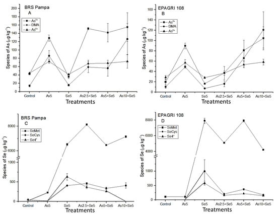 The influence of Se species after As addition was evaluated (Figure 2B,D). The chemical species SeMet is predominant. However, the behavior within treatments is the opposite: for BRS Pampa the addition of 2.5 µg kg−1 of As in soil increased the amount of SeMet. For EPAGRI 108, the addition of As 2.5 µg kg−1 decreased the concentration of SeMet in the grains. When the additions of As were 5 µg kg−1 and 10 µg kg−1 for BRS Pampa, there was a decrease and increase in the concentration of SeMet in grains, respectively. For EPAGRI 108, an increase and decrease were observed for SeMet in grains, respectively (Figure 2B,D).