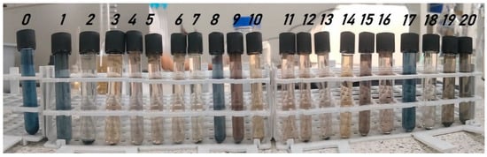 Dyeing wastewater samples before (0) and after treatment (1–20) (0–20 from left to right).