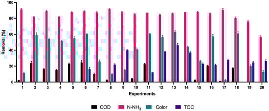 3.2. Removal of COD, TOC, Color, and N-NH3