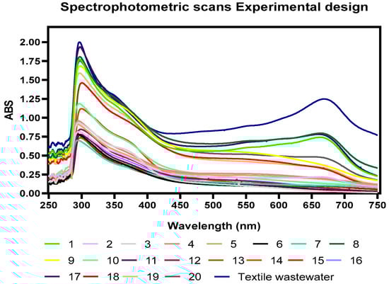 According to the spectrophotometric scanning of the wastewater sample, it was found that the highest absorbance values were found at 297 nm and 673 nm. For color removal, experiments 11, 13, 6, 18, 16, and 2 had the highest removal percentages reaching values of 61.05%, 63.15%, 61.4%, 61.05%, 58.8%, 59.45%, respectively, as shown in Figure 2 and visually evidenced in Figure 1. Likewise, the color reductions were not only at the wavelength of 297 nm, where the highest absorbance peak was present (Figure 3); the scans made from a range of 250 nm to 750 nm show significant color reductions in the wavelength of 673 where treatments 11, 13, 6, 18, 16, 2 achieved the removal of up to 98%.