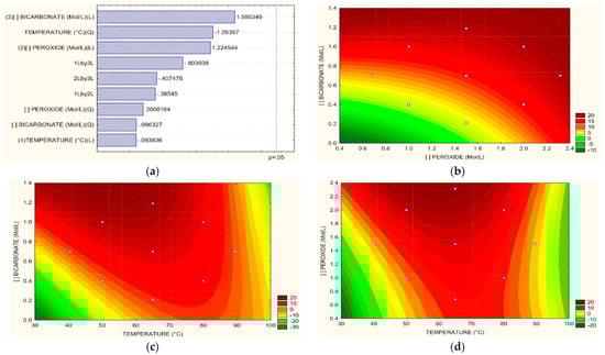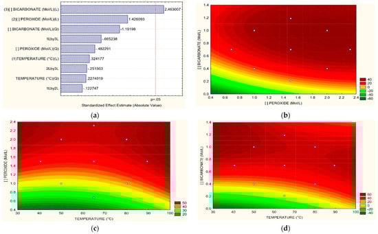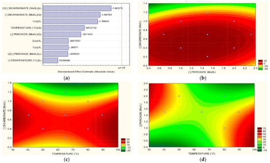 (a) Pareto graphic and Surface Response graphics for color removal percentage of (b) H2O2 vs. HCO3, (c) T vs. H2O2, (d) T vs. HCO3.