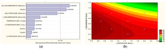 Under the evaluated conditions in Table 2, the COD removal percentages were 27.2%, 25.84%, and 23.08%, as shown in Figure 2. As seen in the Pareto graph (Figure 5a), bicarbonate is the most influential variable for COD removal; however, it is not significant enough. The analysis of the surface response concerning H2O2 vs. HCO3 for COD removal shows that the best results are achieved for high concentrations of both H2O2 and HCO3 in the order of 2 M and 1.2 M, respectively; at low concentrations, the effects of COD removal are not efficient as shown in Figure 5b. When the T vs. HCO3 relation is evaluated, the high concentration of bicarbonate enhances the COD removal, and temperatures between 70 and 80 °C favor excellent results at different bicarbonate concentration levels, as shown in Figure 5c. Concerning the relation between T vs. H2O2, the high temperatures improve the reduction of COD, regardless of peroxide concentration; on the other hand, high concentrations of peroxide are meaningful for the removal of COD up to 20% after 1.4 M of H2O2 according to Figure 5d. Kan et al. [] reported 72% of COD removal after 60 min of oxidation treatment of synthetic wastewater with Acid Orange II (AO II) dye, using an HCO3−/H2O2 system, 180 rpm. It was reported that high temperatures increased the reaction speed, achieving 98.5% of degradation at 54.85 °C. The reaction rate augmented from 0.014 min−1 to 0.106 min−1 as the reaction temperature increased from 24.85 °C to 54.85 °C using activated H2O2 with bicarbonate. Thus, temperature proves to be a determining factor in COD removal, as the results obtained in our research. In addition, it has been reported that the efficiency of COD removal is linked to the pH values; the processes with bicarbonate and peroxide maintain a pH between 8.5 and 9 due to the buffering action of the carbonate/bicarbonate [,] behavior very similar to the results obtained in the present investigation where the final pH was maintained at values between 8.5 and 9 after adding the bicarbonate; it has been indicated that at low pH with a high concentration of H2SO4 in the wastewater, it is possible to remove the hydroxyl radical by sulfate, thus reducing the degradation efficiency [,]. Finally, the structure of the dye is also an essential factor; cationic dyes by adsorption have a high removal efficiency at high pH, while the negatively charged anionic ones present a better efficiency of COD elimination at neutral or weakly acidic pH; it has been reported that the use of bicarbonate can be inefficient in the elimination of COD bound to anionic dyes because the pH value changes the effect of carbonate and bicarbonate anions. After all, some anions are radical scavengers in the pH range of 8–8.6 [].